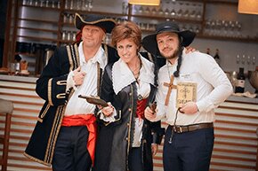 Чтобы гости погрузились в атмосферу сюжета и почувствовали себя героями, к каждому сценарию предусмотрены набор головных уборов и аксессуаров. Пиратам — наглазники и шляпы, индейцам — головные уборы из перьев и бусы.